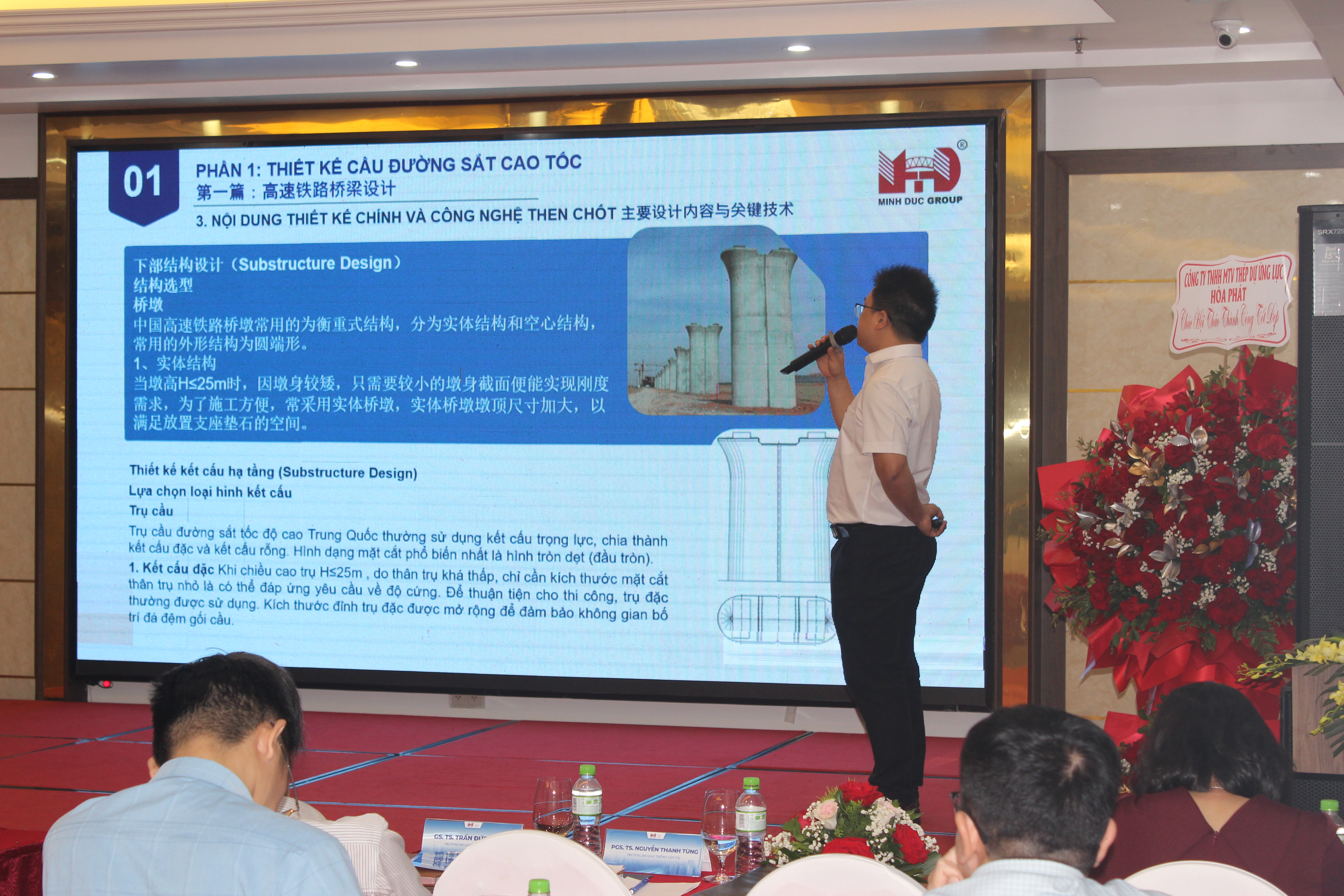 Hội thảo còn nhận được nhiều chia sẻ kinh nghiệm từ Trung Quốc, qua tham luận của chuyên gia Chen Kai (Minh Đức Group), nhấn mạnh vai trò của hệ thống tiêu chuẩn kỹ thuật xuyên suốt và năng lực triển khai ở quy mô lớn. Trong thiết kế cầu đường sắt tốc độ cao, phương pháp ứng suất cho phép được áp dụng đồng bộ trong toàn bộ hệ thống tiêu chuẩn, cùng với các nguyên tắc cốt lõi như an toàn, độ cứng, ổn định và khả năng đáp ứng động lực của kết cấu. Việc tiêu chuẩn hóa và mô-đun hóa không chỉ giúp rút ngắn thời gian thiết kế - thi công, mà còn đảm bảo tính đồng nhất và khả năng kiểm soát chất lượng trên quy mô lớn - yếu tố then chốt trong phát triển hạ tầng tốc độ cao.