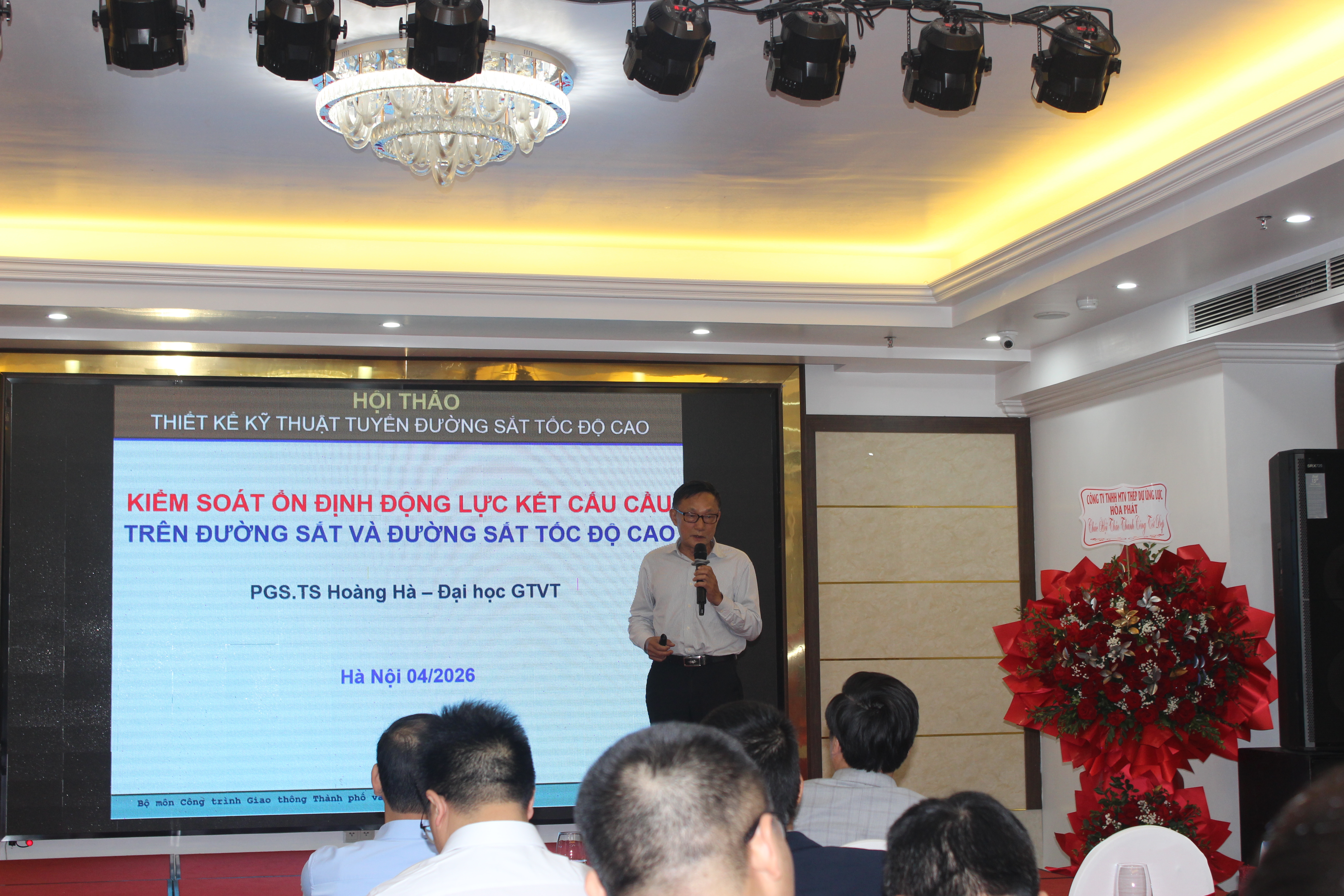 Buổi hội thảo còn có sự tham gia chia sẻ từ PGS.TS Hoàng Hà (Trường Đại học Giao thông Vận tải) về phân tích động cầu đường sắt tốc độ cao. Theo đó, cầu trên đường sắt tốc độ cao có thể chiếm từ 60-90% chiều dài tuyến, đồng thời là hạng mục phức tạp nhất về kỹ thuật, khi phải kiểm soát đồng thời tải trọng lớn, dao động động lực và nguy cơ mất ổn định kết cấu dưới tác động của vận tốc cao.